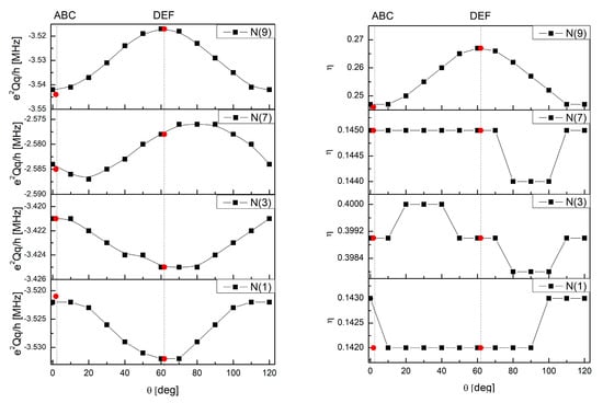 The changes of the NQR parameters of all four nitrogen sites upon the rotation of the methyl group at N(7) in paraxanthine: e2Qq/h(θ) (left) and η(θ) (right). The red points indicate experimental conformations (RT ABC and RT DEF).