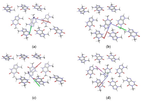 The orientation of the X, Y, and Z axes of the EFG tensor at (a) –N(1)CH3, (b) >N(3)H, (c) –N(7)CH3, and (d) =N(9)– (the Z-axis depicted in magenta, the Y-axis in maroon, and the X-axis in green). The Z-axis is perpendicular to the plane of the central molecule in (a–c) and lies in the plane of the central molecule in (d) (the clusters were cut from the RT DEF structure with optimized proton positions).