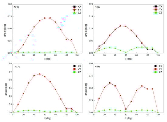 Analysis of the orientation of the main EFG tensor axes upon methyl rotation reveals how they are really affected by the reorientation. The reorientation angles of the EFG tensor axes are small; their values do not exceed 2.4°, as in Figure 7.