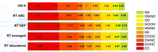 As much as approximately 60% of the PX molecular surface is generated by H atoms, while the other elements (C, N, and O) contribute to much smaller, but almost equivalent percentages, from about 12 to 16%, as in Table 5. The values of the enrichment ratio of the intermolecular contacts, EXY, which reveal privileged (EXY > 1) and disfavored (EXY < 1) contacts between each of the two atomic species, X and Y, are collected in Table 5 and shown in Figure 9. They increase with temperature by only 0.218%, which mainly reflects the reorientation of the -CH3 group.