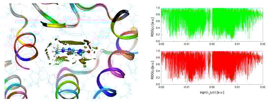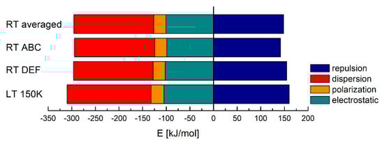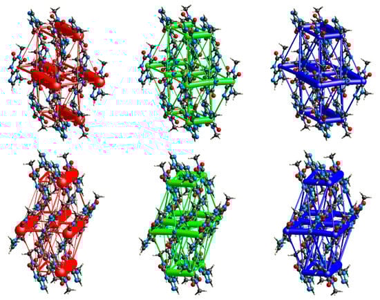 where ∇ρ(r) is the electron density gradient and ρ(r) is electron density; Equation (12) helps to detect interactions that were uncertain or not revealed by QTAIM []. The plot of RDG(r) versus the electron density multiplied by the sign of the λ2 Hessian eigenvalue, sign(λ2)ρ(r), reveals characteristic spikes in the low-gradient and low-density regions as long as the non-covalent contacts are present in the crystalline structure. The spikes not reaching RDG(r) indicate interactions missed by QTAIM due to failure to detect critical points. The nature of non-covalent interactions can be inferred from the sign of λ2. Depending on its value, they are classified as attractive (stabilizing; λ2 < 0) or repulsive (destabilizing; λ2 > 0). A spike in the low-gradient, low-density region at λ2 < 0 suggests a stabilizing interactions, such as a hydrogen bonding; a smaller spike accompanied with only slightly negative λ2 indicates a weakly stabilizing interaction and a spike associated with λ2 > 0 indicates the absence of non-covalent interactions. The results of the RDG analysis were visualized using VMD [].