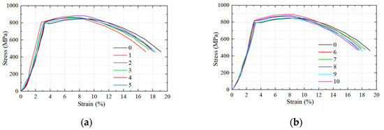 The absorbed work was obtained by calculating the area between the stress–strain curve and the coordinate axis of the tensile sample. The elongation loss and absorbed work loss are calculated according to the following equations: