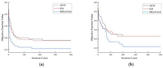 An analysis of the optimization results shows that the ACO and GA have average solution errors of 2.51% and 2.40%, respectively. In contrast, the DELO-GA exhibits an average solution error of 0.88%. Furthermore, the DELO-GA demonstrates faster convergence rates for all five job sizes, requiring less time to find the optimal batch inbound-job schedule. It can also escape the local optimal time more efficiently. Therefore, this study confirms the superior overall performance of the proposed algorithm, making it suitable for solving large-scale FWSBS/RS’s inbound-scheduling problems.