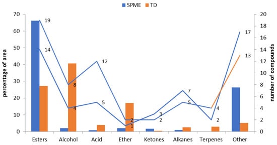According to our results, HS-SPME may a useful extraction method for esters, ketones and other compounds, while for the extraction of alcohol, acid, ethers, alkanes and terpenes, the TD methodology is better. It was initially expected that TD extraction would be more efficient due to the advantages mentioned earlier. Considering these results, a first step, with the aim of the optimization of the TD methodology, would be necessary to gear its strengths. Some desorption parameters, such as desorption time, desorption temperature, low trap cryo-temperature or high trap temperature, and its associations would affect the response of the volatile compounds [].