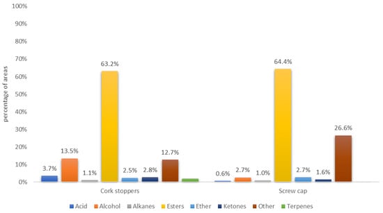 Esters was the most abundant family of compounds in both types of closures. Levels of some families of volatile compounds—for example alcohols, acids and others—are those with wide differences between the type of closures.