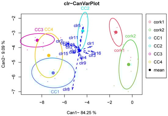 Principal component analysis (PCA) is a commonly employed technique for exploring chemical measurements [,,]. The aim of PCA is to simplify complex data sets by transforming them into a smaller set of uncorrelated variables, known as principal components. These components retain as much of the original variation in the data as possible, making it easier to interpret the underlying patterns and relationships within the data set. The results can be visualized using a biplot. The clr-scores data set is used to perform PCA and to represent a biplot for the CoDa set []. In a clr-biplot, the length of each ray represents the variance of the clr-variable (volatile compound), and the position of the samples can suggest potential clusters. However, a PCA-based plot does not use the information provided by a factor (closure type). When we have more than two groups, the canonical variates plot can also be considered. A canonical variation is a linear combination of particular log-ratios that highlights the differences between groups defined by a factor.