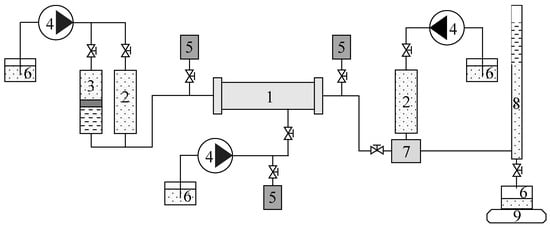 Schematic diagram of the experimental apparatus of the relative permeability measurement. 1—Core gripper; 2—Water container; 3—Piston container; 4—Constant pressure pump; 5—Pressure sensor; 6—Beaker; 7—Back pressure valve; 8—Oil–water measuring container; 9—Electronic balance.