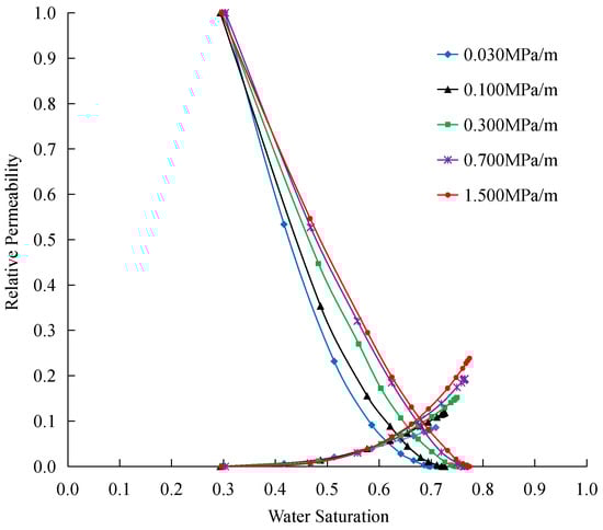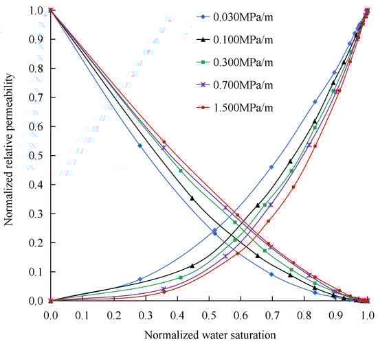 The normalized oil–water relative permeability curves are shown in Figure 3. Compared with the original curves, it is more easily observed that with the increase in the displacement pressure gradient, the camber of the oil-phase curve decreases and the camber of the water-phase curve increases.
