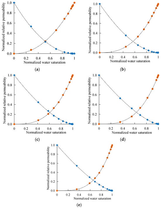 Fitting results of relative permeability curves under different displacement pressure gradients. (a) 0.030 MPa/m; (b) 0.100 MPa/m; (c) 0.300 MPa/m; (d) 0.700 MPa/m; (e) 1.500 MPa/m. Orange dots represent water phase; blue squares represent the oil phase.