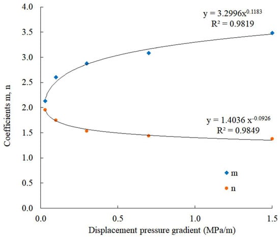 According to the fitting results shown in Figure 3, the coefficients and under different displacement pressure gradients are obtained, as shown in Table 3. With the increase in the displacement pressure gradient, increases and decreases gradually. Figure 5 shows the regression relationship between the coefficients and and the displacement pressure gradient. The corresponding expression is
