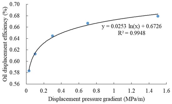 To weaken the influence of the physical property difference of core samples on residual oil saturation, the change rule of residual oil saturation is characterized indirectly by displacement efficiency. As Figure 6 shows, the regression relationship between oil displacement efficiency and displacement pressure gradient meets the logarithmic function. The corresponding expression is