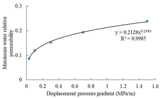 According to the experimental data in Table 2, the regression relationship between the maximum water relative permeability and the displacement pressure gradient is established, as shown in Figure 7. The equation obtained is