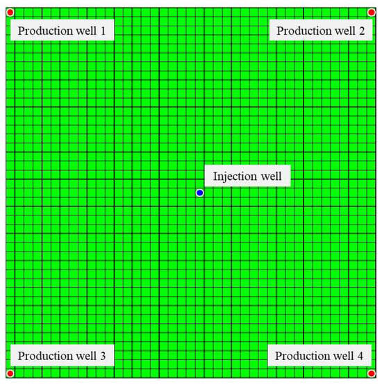 To analyze the effect of the displacement pressure gradient on production performance and remaining oil distribution, a five-point well pattern conceptual model is established as shown in Figure 9. In the numerical simulation of waterflooding reservoirs, the choice of grid size usually takes into account the impact of the number of grids on the calculation speed and whether the changes in saturation and pressure fields between oil and water wells can be accurately determined. The horizontal grid size is generally between 5 and 50m, and the longitudinal grid size is generally between 1 and 5 m. In this study, the number of model grids is 41 × 41 × 5. The horizontal dimension of the grids is 10 m and the vertical dimension is 2 m. The porosity is 36.7%. The horizontal permeability is 2000 mD and the vertical permeability is 130 mD. The formation oil viscosity is 55.0 mPa·s and the oil volume coefficient is 1.065. The initial relative permeability curve is set using the data of 0.100 MPa/m in Figure 2. The production wells are controlled with a constant liquid rate of 120 m3/d. The injection well is controlled by an injection–production ratio of 1.0.