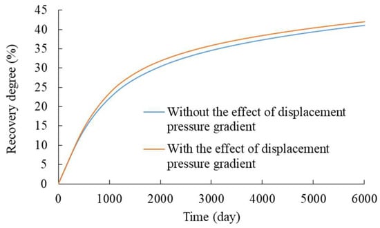 The simulation results with and without the effect of displacement pressure gradient on relative permeability were compared. In the simulation without the effects of displacement pressure gradient, only the initial relative permeability curve was adopted. The difference in the production water cut is shown in Figure 10. When the effect of the displacement pressure gradient is considered, the oil production period without water is prolonged from 195 days to 285 days. The water cut in the early stage of reservoir production is lower with the effect of the displacement pressure gradient, which is reduced from 55.8% to 51.9% on the 1000th day. This is due to the higher pressure gradient in the near-wellbore area, which increases the displacement efficiency. However, the water cut is higher in the later stages. This is the result of higher water relative permeability and rapid water breakthrough in areas with high displacement degrees. The water cut is increased from 94.7% to 95.9% on the 6000th day with the effect of the displacement pressure gradient. In this conceptual model, the factor that the displacement pressure gradient improves the displacement efficiency plays a major role. This results in a higher recovery degree when the effect of displacement pressure gradients is considered, which is increased from 41.0% to 42.6% on the 6000th day as shown in Figure 11.