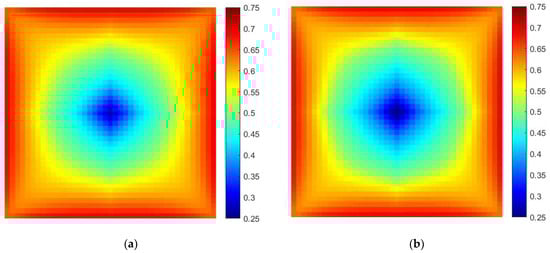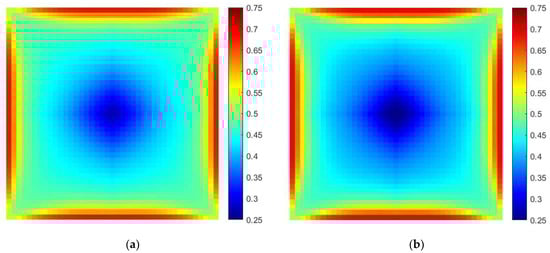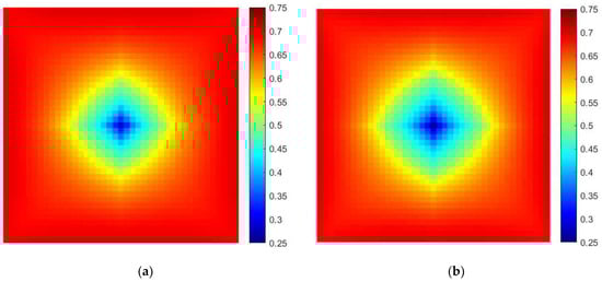 Comparison of the remaining oil saturation in the third layer grid when the water cut is 20%. (a) Without the effect of displacement pressure gradient; (b) with the effect of displacement pressure gradient.