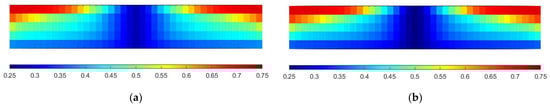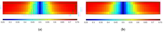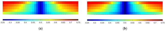 The comparison of the remaining oil saturation in the third layer grid when the water cut is 20%, 60%, and 90% is shown in Figure 12, Figure 13 and Figure 14. When considering the effect of displacement pressure gradient, due to the large pressure gradient in the near-wellbore area and the injection–production main line, the oil displacement efficiency increases after phase permeability correction and the remaining oil saturation is lower. However, the displacement pressure gradient in the area between production wells is small, and the remaining oil saturation is higher. The remaining oil saturation profile between injection and production wells is compared in Figure 15, Figure 16 and Figure 17. Due to the density stratification between the water and oil, more oil is enriched at the top of the reservoir and more water at the bottom. When considering the effect of displacement pressure gradient, the remaining oil saturation near the injection well in all layers decreases. Differently, the saturation at the bottom near production wells is reduced, while the remaining oil is more abundant in the upper part.