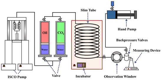 The main parameters of the physical simulation device model used for miscible displacement in this study are shown in Table 3. The process flow of the slim tube experiment is shown in Figure 1. Multiple slim tube oil displacement experiments are conducted according to the displacement scheme, to obtain oil displacement efficiency under different displacement pressures.
