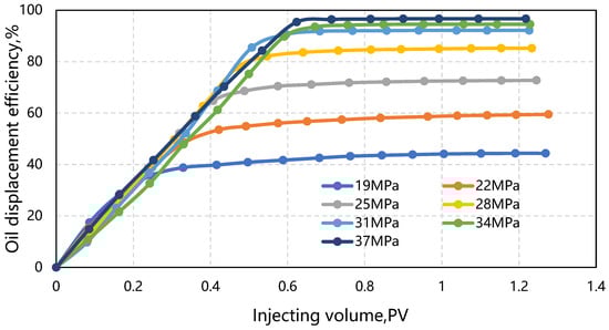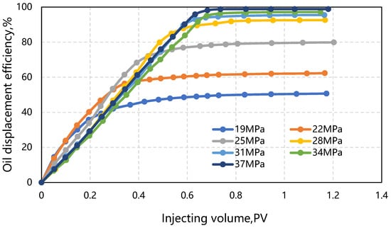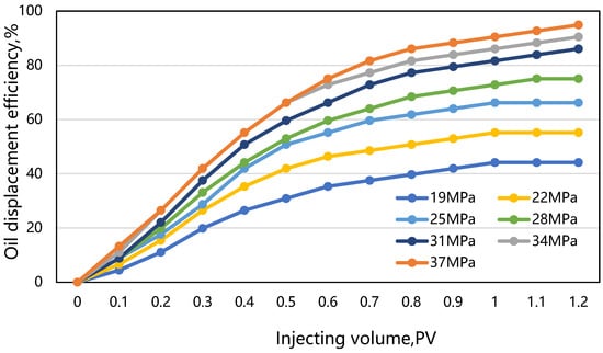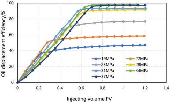 Figure 4 shows the oil recovery efficiency graph for the 12.5 m slim tube CO2 displacement. As can be seen from Figure 4, under different displacement pressures, the crude oil recovery factor gradually increases with the increase in CO2 injection volume. An inflection point appears around 0.9 PV, and when the injection volume reaches 1.2 PV, the oil recovery efficiency does not change anymore. The final recovery rates are, respectively, 44.37%, 59.67%, 72.75%, 85.23%, 92.16%, 94.55%, and 96.69%.