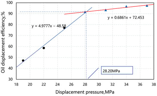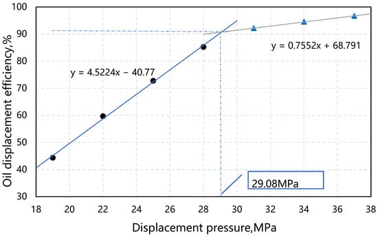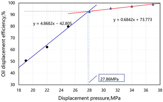 By analyzing the slim tube experimental data and plotting the curves based on the final crude oil recovery factors at various injection pressures, as shown in Figure 9, a linear fit is performed for the data before and after miscibility, and the intersection point of these lines represents the MMP. Therefore, the MMP for CO2–crude oil as measured by the 25 m slim tube is determined to be 27.86 MPa, as detailed in Table 7.