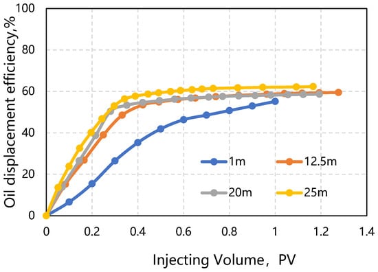 Figure 10 and Figure 11 show the oil recovery efficiency curves for different slim tube lengths at non-miscible (22 MPa) and miscible (31 MPa) points. From Figure 10, it is evident that before reaching miscibility, the longer the slim tube, the higher the oil recovery efficiency when the same pore volume multiple of CO2 is injected. As shown in Figure 11, at the point of miscibility, when the slim tube length exceeds 12.5 m, the oil recovery efficiency is similar for the same pore volume multiple of CO2 injection, while at a slim tube length of 1 m, the efficiency is significantly different.