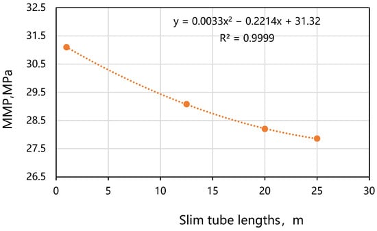 From the CO2 displacement experiment results using slim tubes of various lengths, it is observed that the MMP for CO2–crude oil gradually decreases with increasing slim tube length. As depicted in Figure 12, through linear fitting of the experimental data, an empirical formula relating MMP to slim tube length is obtained: y = 0.0033x2 − 0.2214x + 31.32, showing a high degree of correlation. This formula provides a reference for estimating the MMP in miscible CO2 displacement experiments with different slim tube lengths. As shown in Figure 12, the MMP decreases from 31.1 MPa to 27.86 MPa with increasing slim tube length. This decrease is attributed to the increased gas–liquid contact area with longer tubes, enhancing mass transfer between bubbles and liquid, improving solubility, and thereby reducing the MMP of CO2-formation oil.