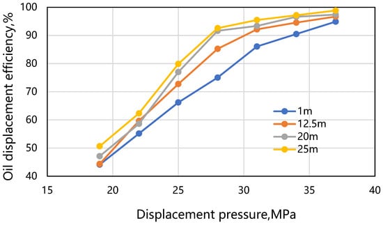 Oil displacement efficiency at different slim tube lengths and displacement pressures.