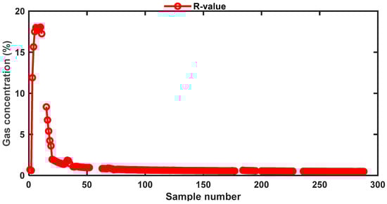 - Case Study 2: A mine in Guizhou Province was developed with inclined shafts, including a main inclined shaft, an auxiliary inclined shaft, and a return air inclined shaft. The elevation of the main inclined shaft’s entrance is +1234.5 m, the auxiliary inclined shaft’s entrance is +1236 m, and the return air inclined shaft’s entrance is +1240.963 m. A significant carbon monoxide poisoning incident occurred in this mine on 29 March 2012 at the 2902 transport tunnel heading face in the second mining area. On the day of the accident, the mine’s gas concentration monitoring system collected data on gas concentration at 5 min intervals. For this analysis, 288 gas concentration data points collected from 00:00 29 March 2012 to the following day at 00:00 were selected. The first 200 data points were used as the training set, and the remaining 88 were used as the test set for the predictive analysis of gas concentration changes using the PSO-SLTM model. A typical gas concentration dataset is shown in Figure 2.Figure 2. Typical gas concentration data two.