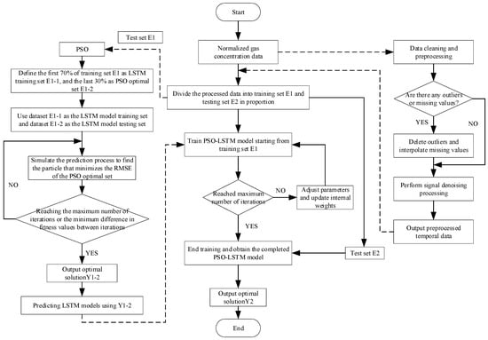 The principle of the PSO-LSTM model is to enhance the training of gas concentration data by combining the PSO algorithm and LSTM algorithm. The PSO algorithm optimizes the data, which are then used as the test set for the LSTM algorithm. This process ensures that the training results of the LSTM algorithm are more accurate. The flowchart is shown in Figure 6.