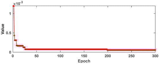 The key parameters of the LSTM network were obtained using PSO optimization calculation, and the convergence curve of the optimal fitness of the process was shown in Figure 7. The best fitness convergence curve of PSO is an important index to reflect the optimization process of the PSO algorithm, and the convergence curve can show the change trend of the fitness value of the PSO algorithm in the optimization process. As can be seen from the figure, when the epoch of the PSO algorithm belongs to the range [0, 25], the fitness of convergence curve decreases rapidly, indicating that the convergence speed is fast and the algorithm efficiency is high in the initial stage. It becomes stable after epoch = 25 with a value of 7.49 × 10−5, and remains stable in the range of 25,200 for a long period of time. Then, there will be a slight decrease at epoch = 200 and then it will enter a stable state again, when the value reaches 5.66 × 10−5. Considering the convergence rate and other factors, epoch = 50 is chosen as the global optimal solution. It can be seen from the figure that the fitness convergence curve of PSO tends to be stable and the fitness value is low, so it can be judged that the PSO algorithm has found the global optimal solution.
