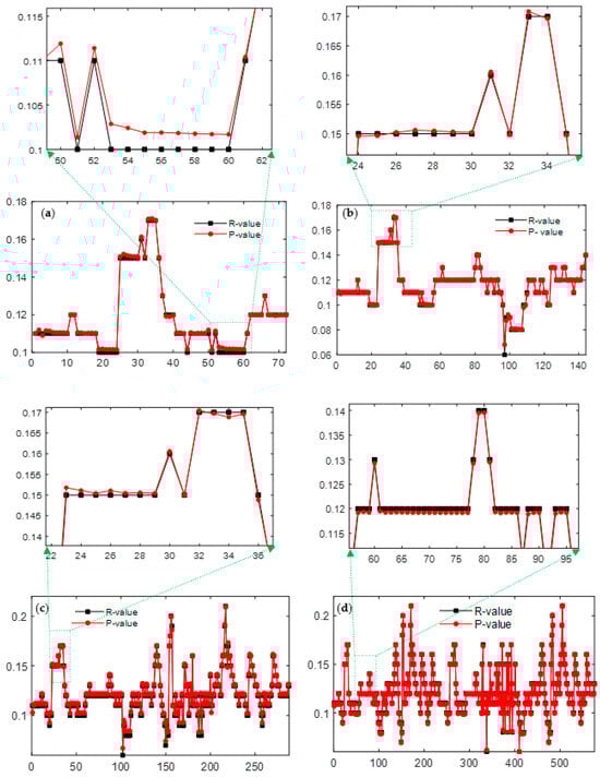 The gas monitoring system of the working face collected gas concentration data at 5 min intervals. For this study, 288 gas concentration data points collected from 0:00 28 November 2012 to 0:00 the next day were selected as the sample data to establish a mine gas concentration time series. To study the impact of different sample data volumes on model prediction accuracy, four gas concentration datasets of 6 h, 12 h, 24 h, and 48 h in duration were selected for training and prediction from different data length perspectives. The results are shown in Figure 8a–d; the localized area on the plot is zoomed in on the top of each of these plots, so that the detailed effect of that part can be seen. As can be seen, the predicted and actual values agree well, but there are still minor differences.