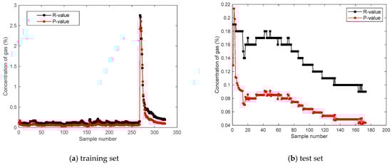 After preprocessing the data, 70% of the data were as selected for training the model, and the remaining 30% were as used as a test set. For the typical gas concentration data of one (Figure 1) and two (Figure 2), a comparative prediction study was conducted using the PSO-LSTM model and the LSTM model. The prediction result for typical gas concentration data one is shown in Figure 13, and the prediction result for case two is shown in Figure 14. From Figure 13 and Figure 14, it can be observed that the prediction curve of the PSO-LSTM model becomes stable more quickly than that of the LSTM model, and its curve is closer to the curve of the actual values.