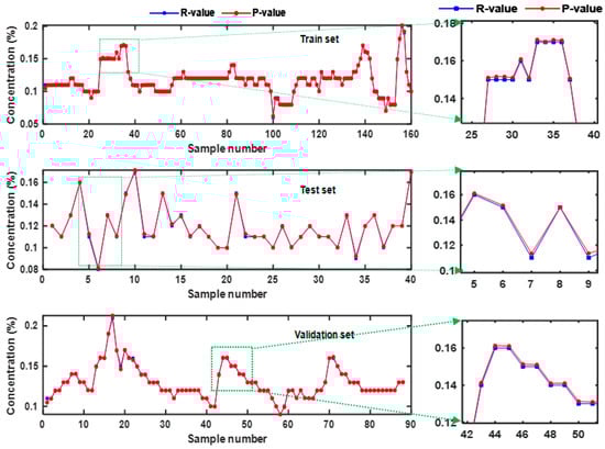 To verify the feasibility and effectiveness of the model, typical gas concentration data from a mine in Guizhou from August 2012 to November 2015 were selected for study. The original input data were first converted to a format compatible with the model’s input dimensions. The transformed dataset was then divided into training, testing, and validation sets to verify the model’s fitting effectiveness. The first 200 data points were chosen as the training set, the following 88 as the test set, and an additional 40 data points were selected as the validation set. The PSO-LSTM model was used for the gas concentration prediction study and the model’s training set loss rate was calculated. The prediction results for the training, test, and validation sets are shown in Figure 10. As shown in Figure 10, on the left side of the figure the prediction results are shown and on the right side the corresponding local zoomed-in image is shown.