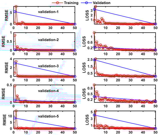 The core idea of cross-validation is to divide the original dataset into groups, using some as the training set to train the model and others as the test set to evaluate the model. The benefits of cross-validation include evaluating the predictive performance of a model, particularly how well a trained model performs on new data, which can help to reduce overfitting to some extent. It also maximizes the extraction of useful information from limited data and aids in selecting the appropriate model. This paper opts for k-fold cross-validation, which reduces variance by averaging the results of training on k different groupings, thus decreasing the model’s performance sensitivity to data division. Given the modest size of the dataset, a k value of 5 is chosen. Based on this, the MATLAB cross-validation function (such as crossvalid) is used to divide the data. A loop structure is then utilized to sequentially use each subset as the validation set and the remaining subsets as the training set for multiple cross-validations. In each cross-validation, the training set is used to train the PSO-LSTM model, and the validation set to obtain prediction results. After each validation, evaluation metrics (such as RMSE, MAE, ME, etc.) are calculated and recorded. The variation in the prediction model’s loss rate (LOSS) during this cross-validation process is illustrated in Figure 11. The LOSS is a performance metric that reflects the model’s fit to the training data. Observing the PSO-LSTM model’s loss rate reveals that, although initially high, it generally stabilizes after about 20 iterations, indicating the model’s gradual convergence to an optimal solution. The fourth cross-validation shows the lowest LOSS, suggesting the best predictive capability in this instance.