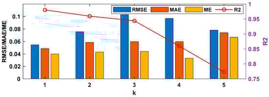As can be seen from Figure 12, R2 is generally higher than 90% when cross-validation is performed for 1–4 times, and in the first cross-validation validation, it reaches 0.9804. With the progress of cross-validation, the low value of 0.7728 appears in the fifth cross-validation, which is consistent with the results in Figure 11, and a high loss rate appears in this cross-validation. From the results of the RMSE, MAE and ME evaluation indicators, the maximum value of RMSE is 0.1032 and the minimum value of 0.0547, while the maximum value of MAE is 0.0740 and the minimum value of MAE is 0.0487. It can be seen that the value of RMSE will be greater than the value of MAE. When the error is small, they may not differ much, but as the error increases, the value of the RMSE will increase more quickly because it is more affected by the large error. Considering these indexes comprehensively, the performance of the prediction model can be evaluated more comprehensively, and the most suitable evaluation indexes can be selected according to the specific needs.