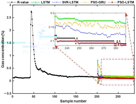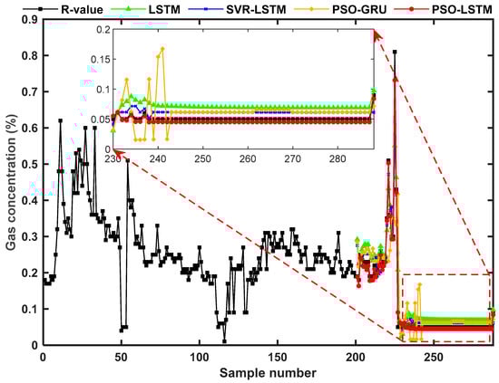 To scientifically assess the model’s performance, the overall Root Mean Squared Error (RMSE) and Mean Absolute Error (MAE) were calculated for each model to verify the feasibility and effectiveness of the method. The final results showed that the PSO-LSTM model’s gas concentration prediction was validated and analyzed using the evaluation formulas for MAE, RMSE, and the coefficient of determination R2, yielding an MAE of 0.0008, an RMSE of 0.0010, and an R2 of 0.9987. The small MAE and RMSE indicate that the model has a small measurement error, and the R2 value close to 1 suggests a high degree of model fit, demonstrating the model’s practical value.