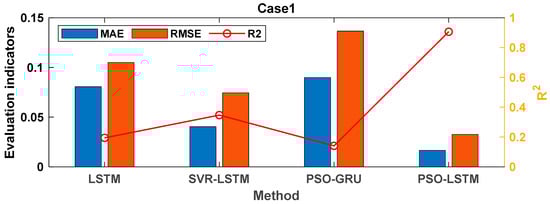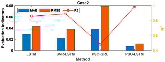 To observe the prediction results more intuitively, the actual values and the predicted values of the four models are visualized for comparison, as shown in Figure 13, Figure 14 and Figure 15. From these figures, it can be observed that the value of MAE is consistently lower than that of RMSE, and the trend of the R2 curve aligns with the overall trend of MAE and RMSE. Lower values of RMSE and MAE indicate a higher degree of concordance between predicted and actual values, while higher values indicate greater prediction errors. R2 evaluates the degree of fit of the curve; the closer it is to 1, the better the fit and thus the better the prediction effect. Specifically, the comparative performance of all models from highest to lowest is: PSO-LSTM > SVR-LSTM > LSTM > PSO-GRU. Among them, the PSO-LSTM combination model exhibits exceptional predictive performance, followed by the SVR-LSTM model. The LSTM model, despite experiencing significant fluctuations, performs better overall than PSO-GRU.