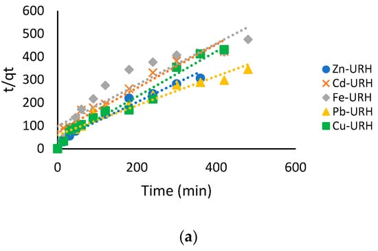 For this, the pseudo-first-order and pseudo-second-order models were used []. The linearized model equations used are shown in Equations (5) and (6).