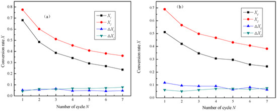 In order to further analyze the effect of different sintering conditions on the reduction in CaO reactivity, this section studies the variation in the CaO conversion rate with the number of cycles at different stages, which is shown in Figure 7.