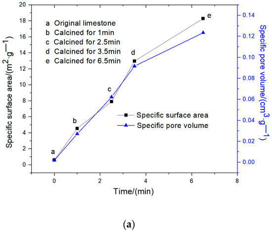 As shown in Figure 9, the pore distribution of the calcined/carbonated products changes regularly with the progress of the calcined/carbonated reaction. As can be observed in Figure 9a, the original limestone is basically non-porous, so its specific surface area and specific pore volume are very small. After 1 min of calcination, the double peaks were prominent, and micropores, medium pores and large pores appeared, but the total number of the three kinds of pores was small, so the specific surface area and specific pore volume of the calcined products were still small at this time. After calcination for 2.5 min, the first peak changed little, but the peak value of the second peak increased rapidly, indicating that the middle pore formed sharply and promoted the ratio table.