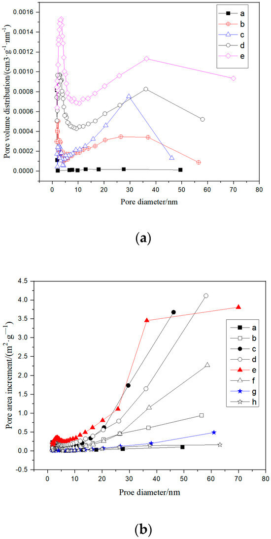 The pore distribution of the products in the process of calcination/carbonation of limestone includes pore area distribution and pore volume distribution, which show the pore area and pore volume occupied by different void sizes. The study of pore distribution can better show the changes in pore structure in the process of calcination/carbonation of limestone. According to IUPAC’s classification of pore size, a pore size less than 2 nm is a micropore, a pore size between 2 and 50 nm is a mesopore, and a pore size greater than 50 nm is a macropore [21]. A micropore provides a huge inner surface for the reaction, a middle pore is the main channel into a micropore, and a large pore is a rough channel for transporting the reaction component.