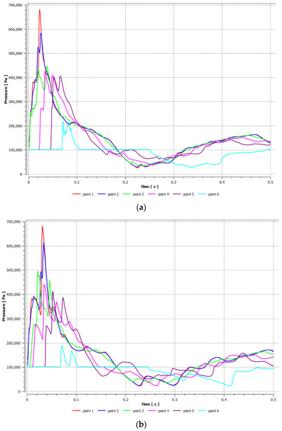 To determine the impact of explosion source interval distance on the pressure distribution within the tunnel following an explosion, a comparative analysis of the pressure dynamic changes in the tunnel post-explosion was conducted for three different models. Monitoring points were set from left to right as follows: Point 1 at the closed end, Point 2 at the center of explosion source 1, Point 3 at the middle of the front section of the tunnel, Point 4 at the middle of the tunnel, Point 5 at the middle of the rear section of the tunnel, and Point 6 at the tunnel exit, as shown in Figure 16.