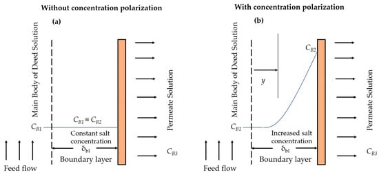 Schematic representation of concentration polarization: (a) without CP, (b) with CP [].