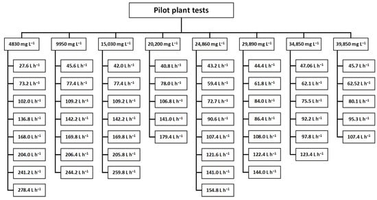 A reverse osmosis plant with a production capacity of 1.44 m3 d−1 was used. The pilot plant was operated at different concentrations (Section 2.1) and at various flow rates from 27.6 to 278.4 L h−1 (Figure 4), with a total of 53 experiments, each experiment having 5 repetitions for a total of 265 tests.