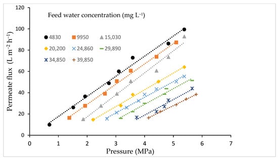 Figure 6 shows that as the concentration of the feed solution increases, a higher pumping operating pressure is required to overcome the osmotic pressure. This is why, at low concentrations, the pressure range is greater. For example, for a concentration of 4830 mg L−1 (0.69–5.38 MPa), in contrast to the higher feed concentration of 39,850 mg L−1 (4.14–5.79 MPa), the operating pressure range decreases. In other words, the operating pressure range is inversely proportional to the increase in salt concentration [].