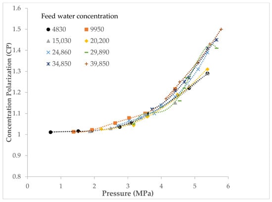 Table 2 and Table 3 show that at concentrations of 4830 and 9950 mg L−1, since the feed water has low salinity, there is no CP because no salt agglomeration forms in the active layer of the membrane at pressures below 3.59 MPa. However, at pressures close to or greater than 4.83 MPa, exceeded values occur that compromise the operation of the reverse osmosis system. Table 4, Table 5, Table 6 and Table 7 show that there is a transition in the CP variable result at a range of pressure (4.83–5.65 MPa) because at lower pressures, there is salt accumulation in the active layer of the membrane, which causes an increase in osmotic pressure, suggesting a rigorous chemical pretreatment system with the addition of antiscalants to regulate the CP phenomenon.