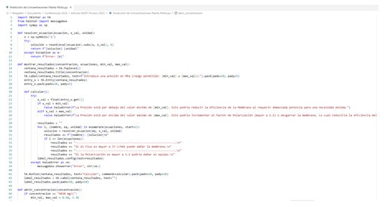 The Python software script (Figure 8) is based on the mathematical models in Table 10 and Table 11. The program code was developed to predict the parameters of permeate flow, flux, and concentration polarization at various pressures, which could not be performed during the experiment.