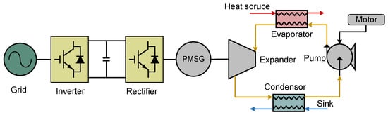 ORC is a technology that harnesses low-grade thermal energy for power generation. It offers relatively high thermo-electric conversion efficiency and is considered suitable for large-scale applications []. The overall configuration of the ORC power generation system and its control architecture is shown in Figure 1.