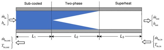 Figure 2 illustrates the three distinct regions in the moving boundary model. The subcooled region refers to the state in which the fluid remains in a subcooled condition inside the tube, during which the working fluid transitions from a subcooled liquid to a saturated liquid. The two-phase region represents the phase-change zone of the working fluid, describing its state transition during evaporation or condensation in the heat exchange process. Finally, in the superheated region, the working fluid evolves from saturated vapor into superheated vapor, carrying additional energy.