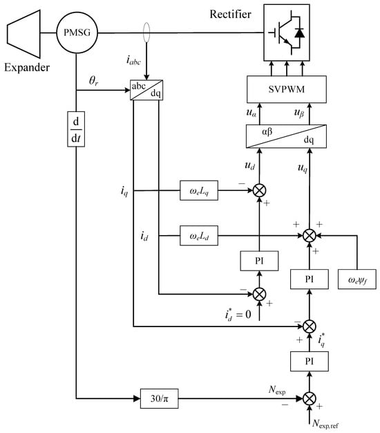 The control process for regulating the expander’s rotational speed via the rectifier is illustrated in Figure 4. First, the rotor position  and the phase currents  are measured and subsequently transformed to obtain  and . The reference rotational speed is denoted as , while  represents the actual rotational speed. The resulting error is processed through a PI controller to generate the reference current . This reference current is compared with the actual , and the coupled voltage term is added to yield the reference voltage . For d-axis control, no speed loop is required. Instead, the reference voltage  is obtained directly through PI control action combined with the influence of the coupled voltage. Finally, the two reference voltages are transformed into the  coordinate system to produce the reference voltages  and . The switching of the rectifier devices is then governed by the SVPWM modulation technique.