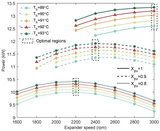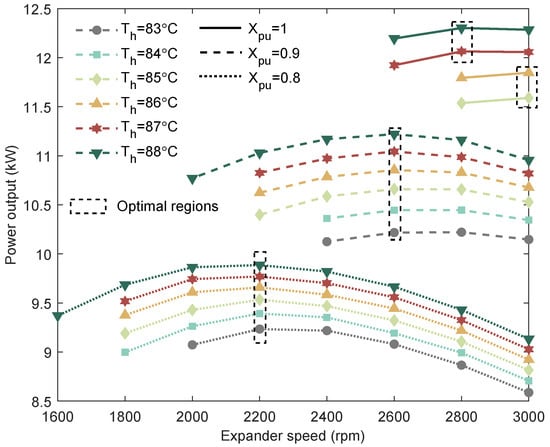 Power output variation under different expander rotational speeds and working fluid pump flow rates under super-rated heat source temperature conditions.